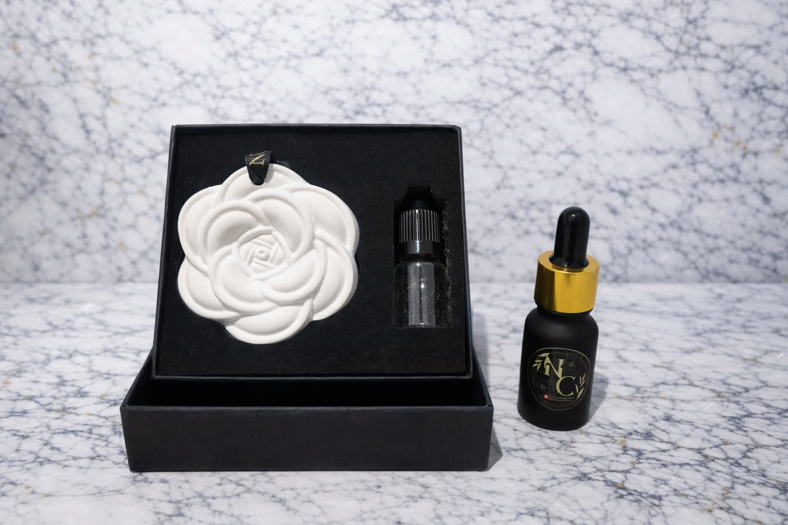 fleur en céramique avec fiole de parfum 5ml inclu dans le coffret + 1 recharge de 10 ml fournis avec le lot.